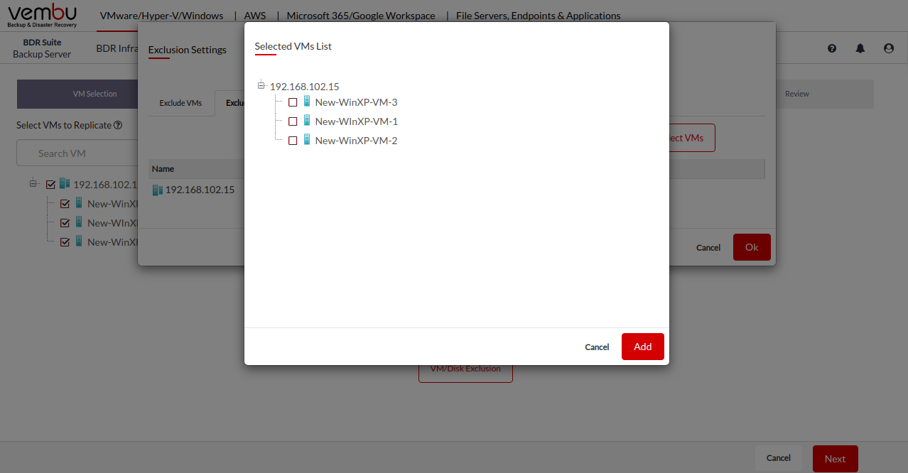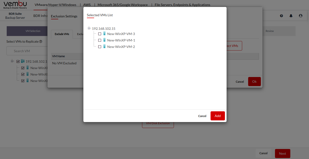 Click on Select VMs and select the VMs that need to be excluded from this replication schedule. Click on Add to add the selected VMs to the Exclude VM list.