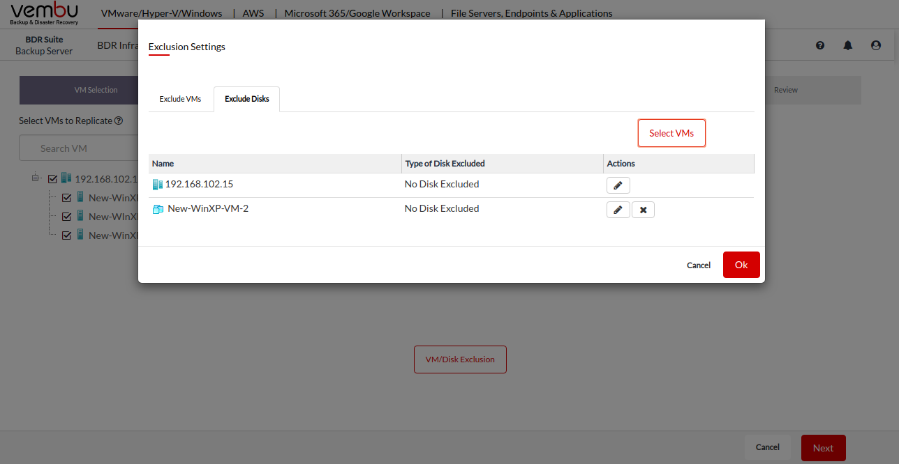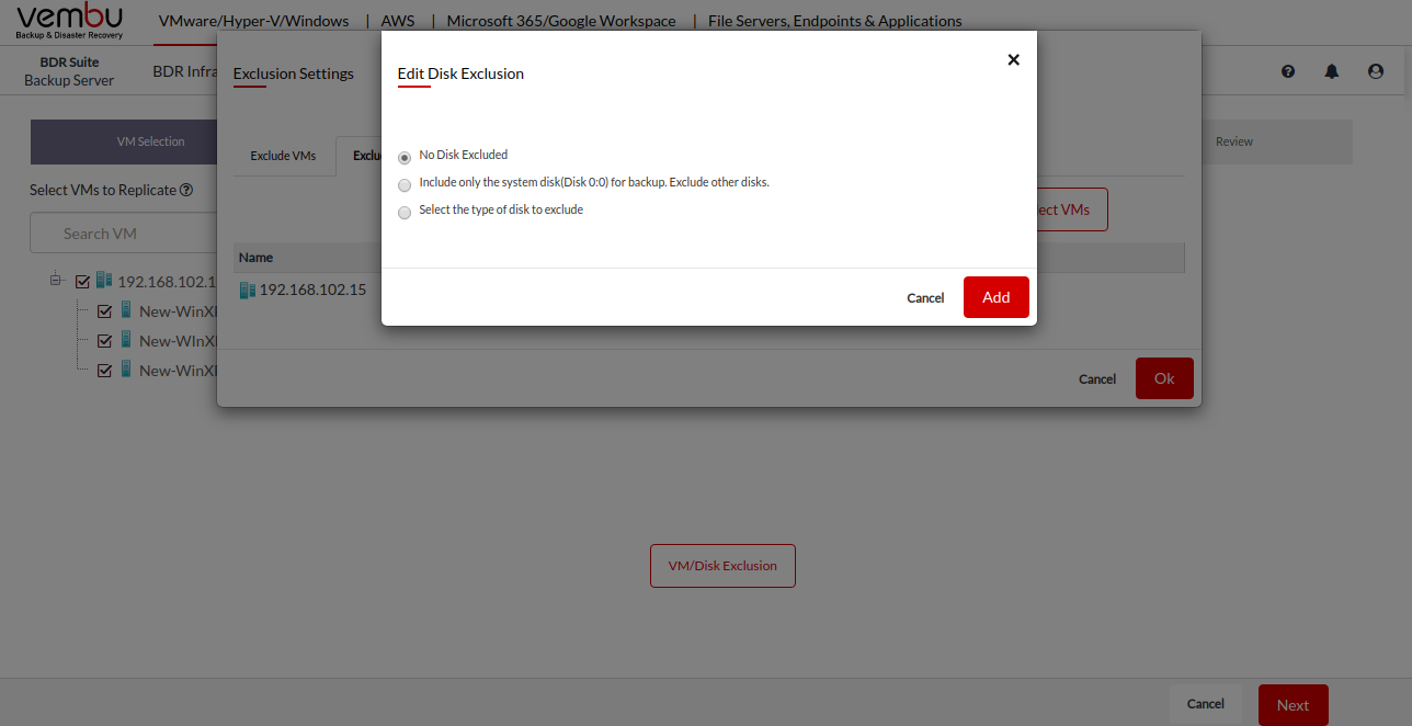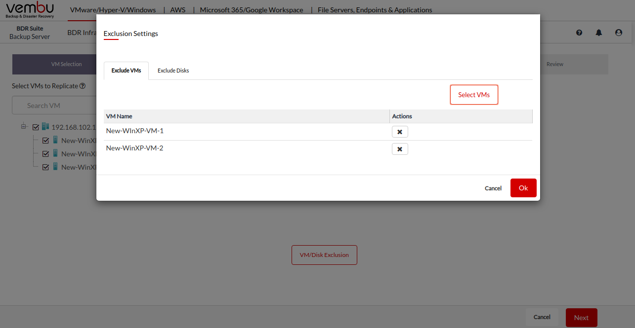 Upon choosing the VM/Disk Exclusion option, you will get a pop-up displayed below. Choose the 'Exclude VMs' tab.