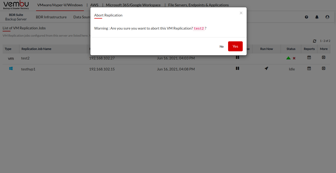 - Select the x mark in the status section to abort your replication schedule. From the Abort Replication pop-up window, click Yes.