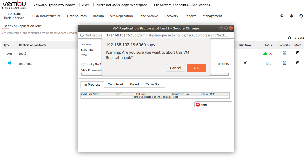 - You can abort your replication if not required, from the Abort (-) option available in the progress window. You will get a popup window as shown below. Click OK to Abort your replication.
