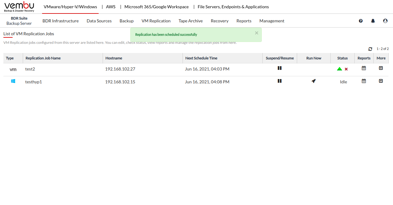- Once you click Yes from the pop-up window, the replication will be scheduled and you will be alerted with the window displayed below.