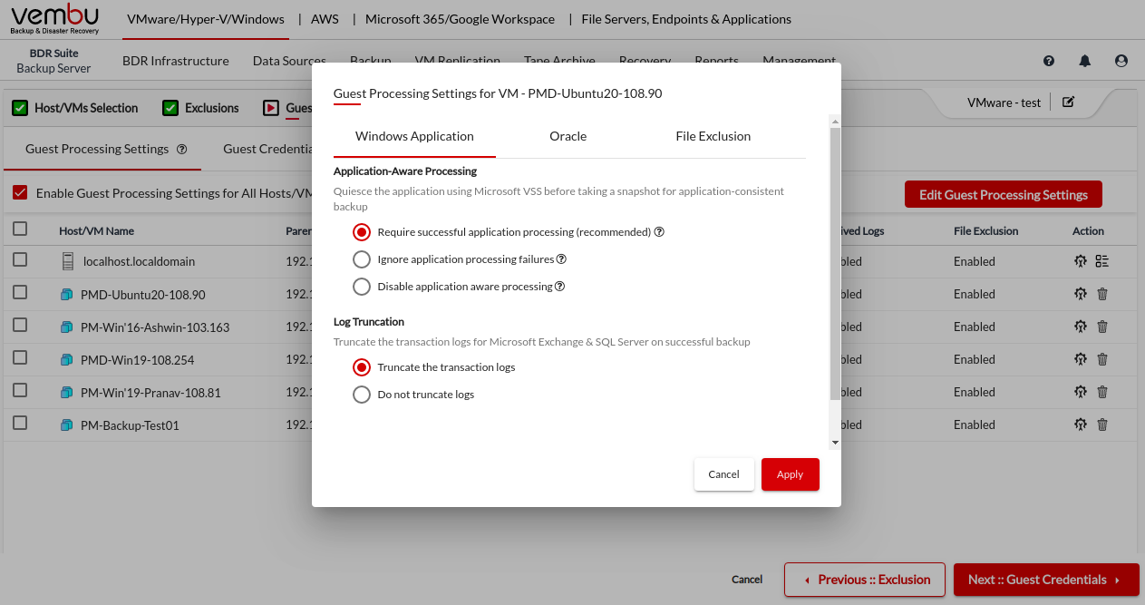 If you are backing up a Windows VM with Microsoft applications such as Exchange, SQL, SharePoint, or AD, under the Windows Application tab, you can see the options to customize the Application-aware Processing & Log Truncation.