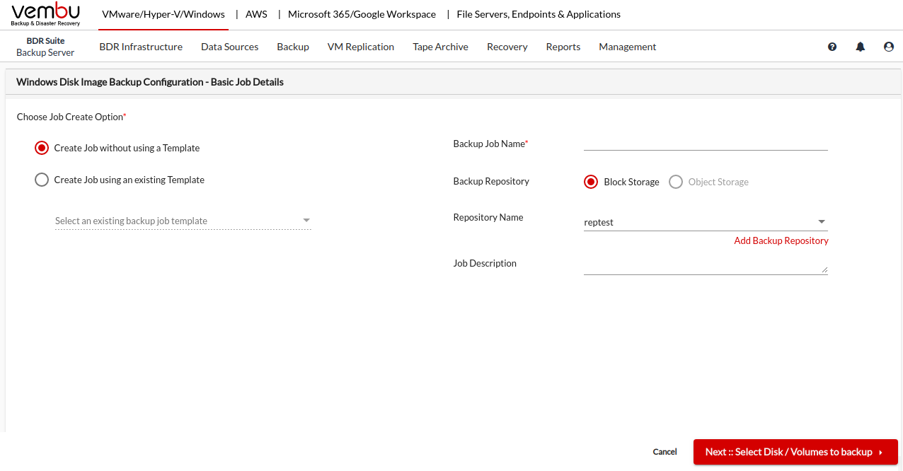 Get started by creating a backup job by choosing Job Create Option, choose to Create Job without using a template if you want to create a backup from scratch, or choose to Create Job using an existing template if you would like to use an already created template for the backup job creation.