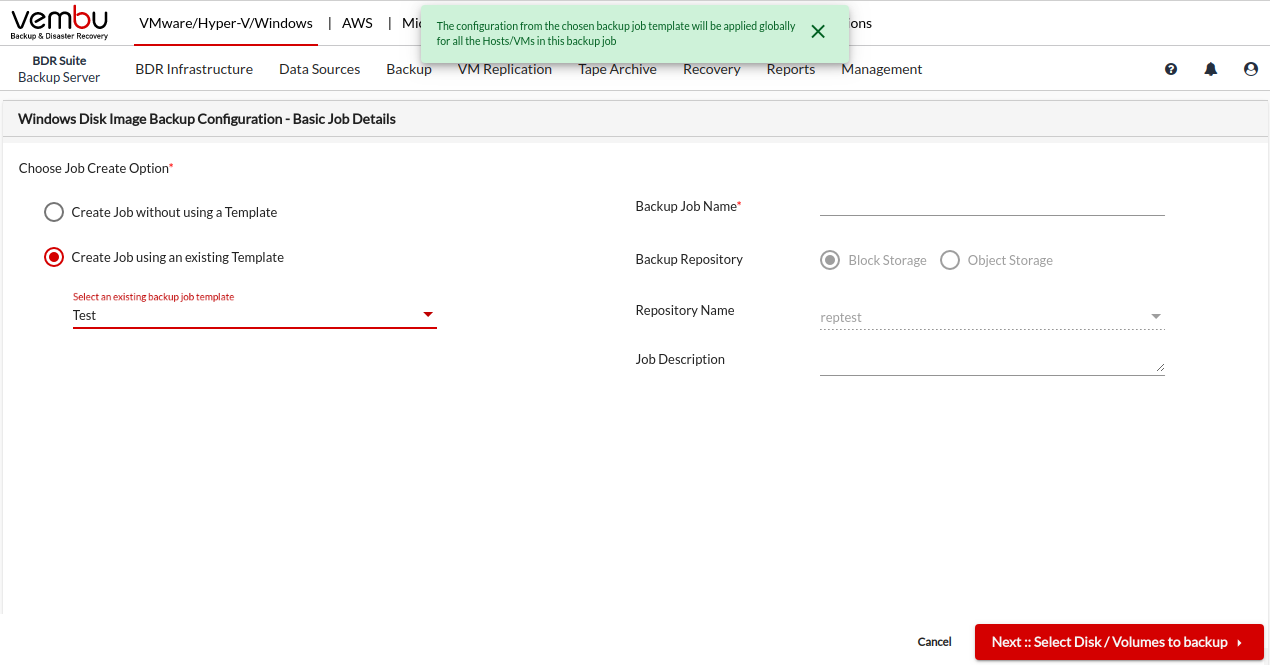 If you choose to Create Job using an existing template, you have to select an already created template you want to use for this backup job. Selecting a backup job template will load the VM/Disk Exclusion, Guest VM Processing, Backup Scheduling & Job Settings from the selected template.