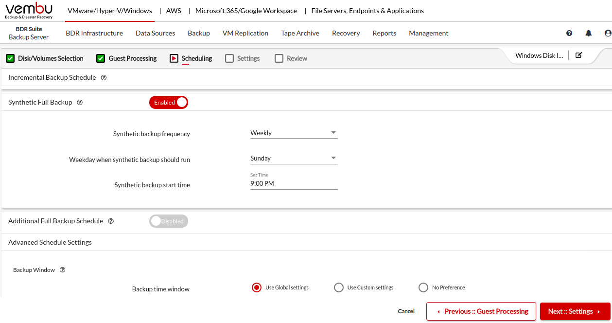 Running an additional full backup periodically is resource-intensive and requires more network bandwidth. In these situations, you can use the synthetic full backup option of Vembu BDR as an alternative.