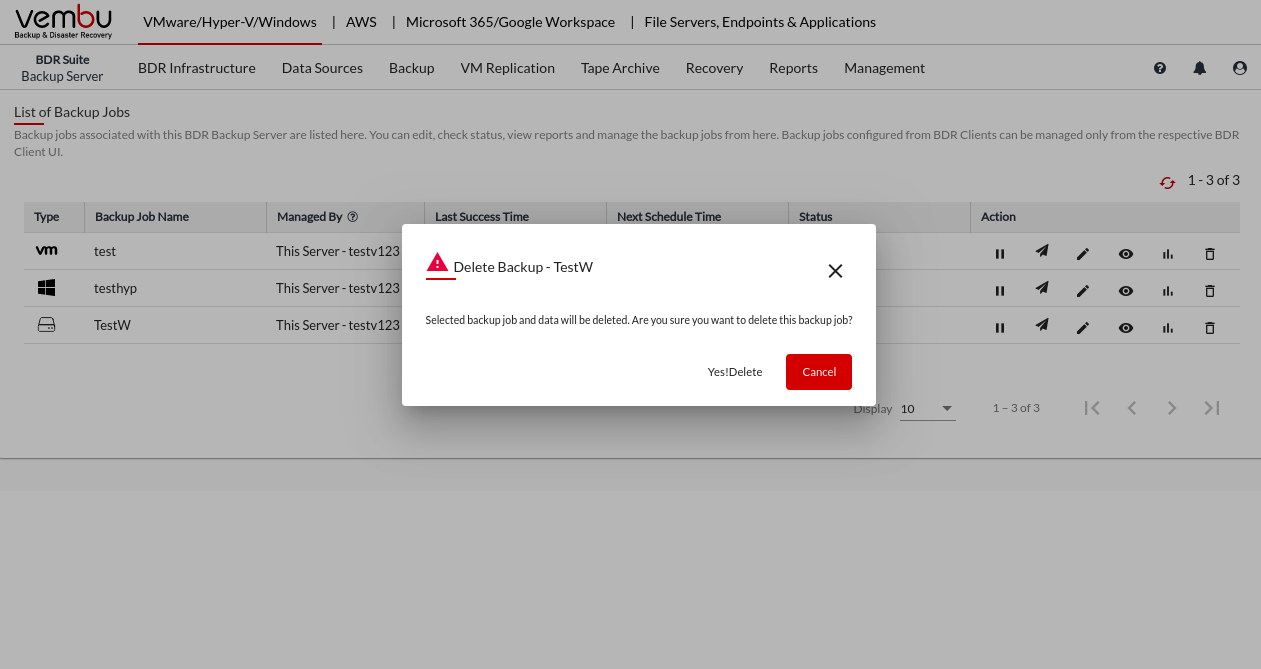 Remove the backup job and the data associated with it. From the List Jobs page, select the More option and click Delete option. You will get the pop-up displayed below. Click Yes to delete the backup job.