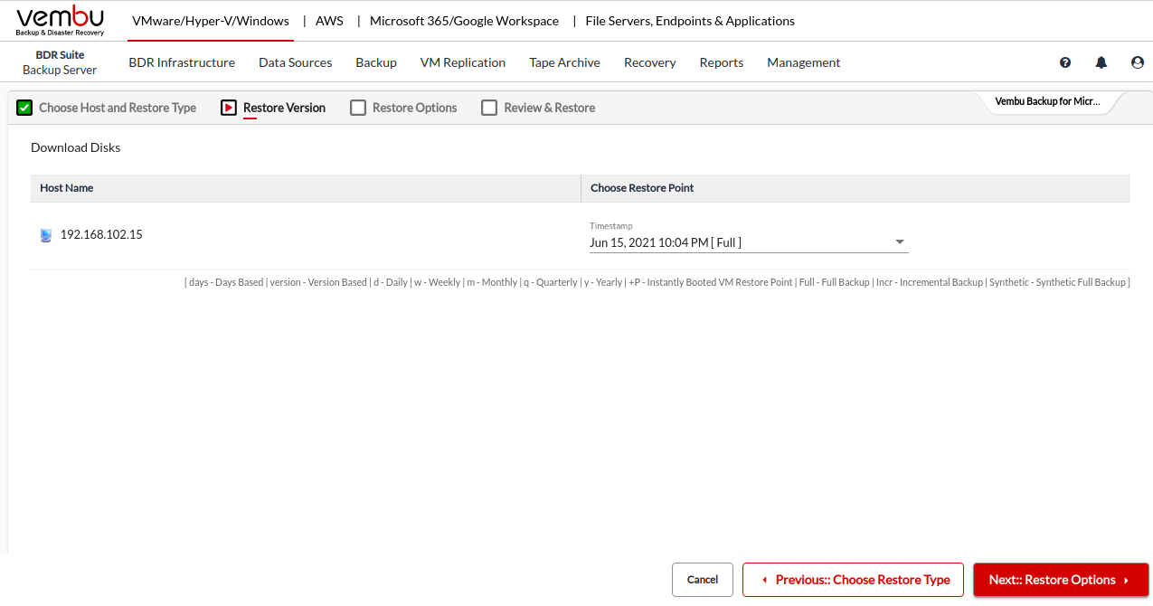 Select a restore point to restore the backup data. Vembu BDR Backup Server retains the restore points as per the retention policy you have selected for the backup job.