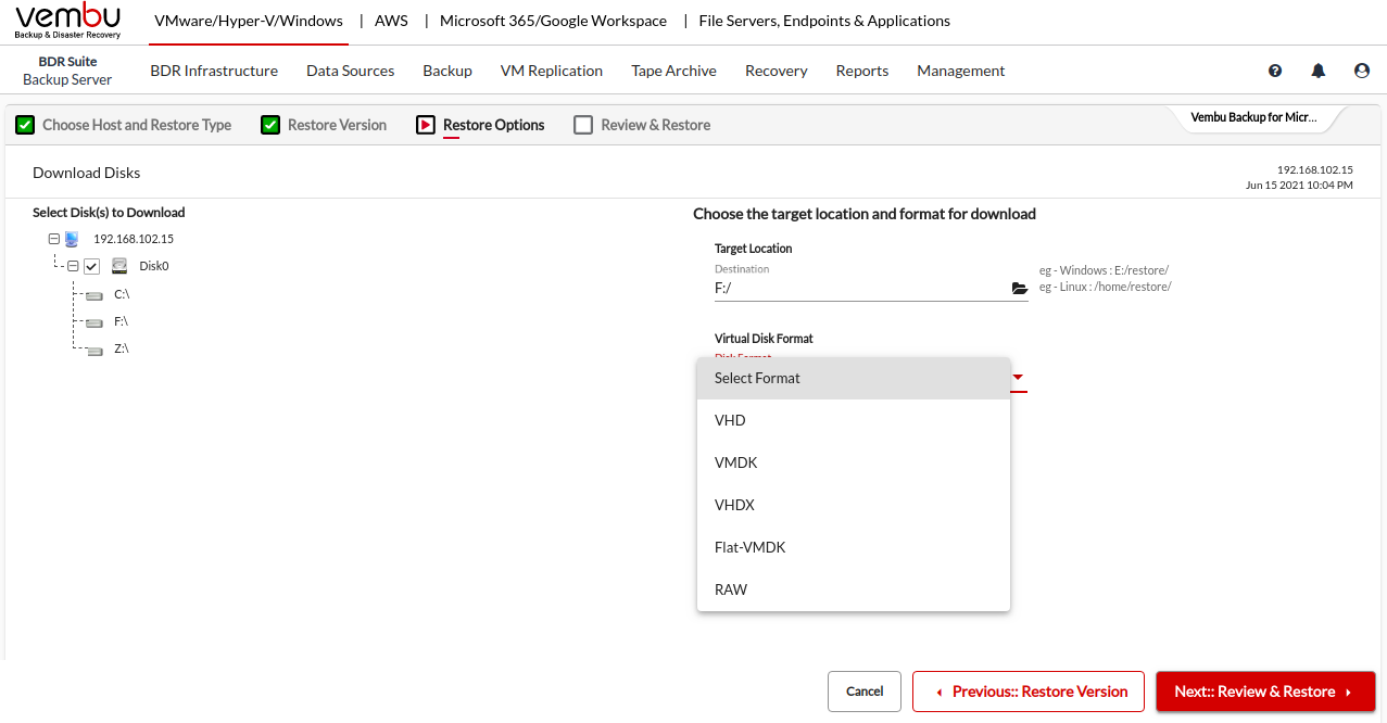 Download option allows you to download backup data to multiple virtual machine file formats such as VHD, VMDK, VHDX, Flat-VMDK, and RAW.