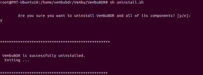 Running the above command will ask you to confirm the uninstallation of Vembu BDR and all of its components. Choose 'y' for a yes and proceed.