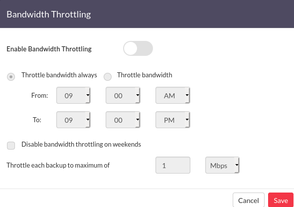 Throttle bandwidth ‘From’ - ‘To’- This option allows you to specify a time frame when the applied throttling will be active.