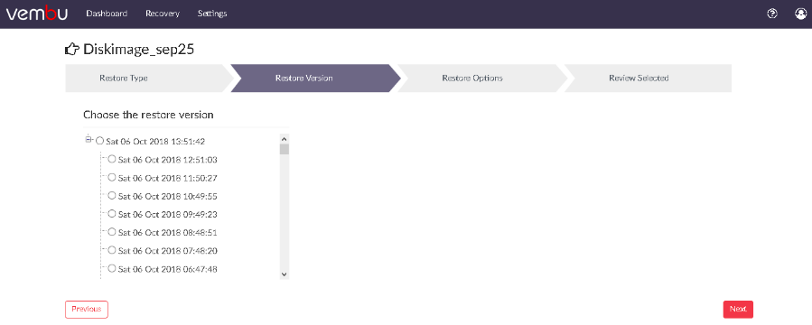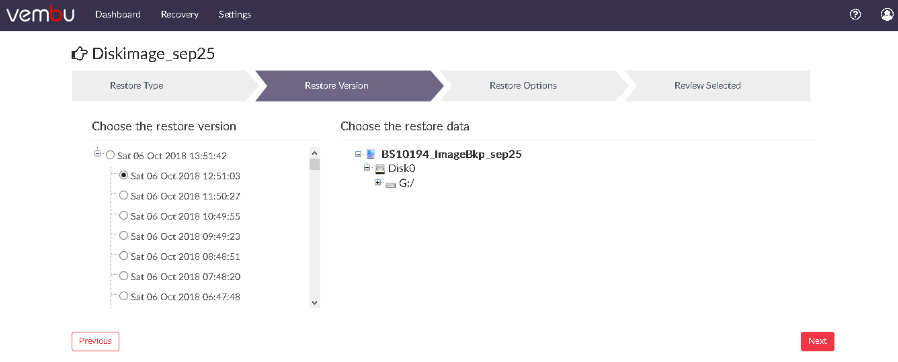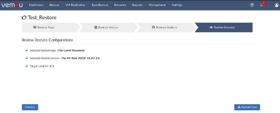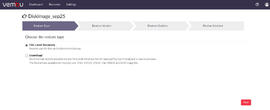 - Click the Recovery tab and select the restore icon near the backup that is to be restored. Select File Level Recovery as the Restore type and click Next to proceed with the restore process.
