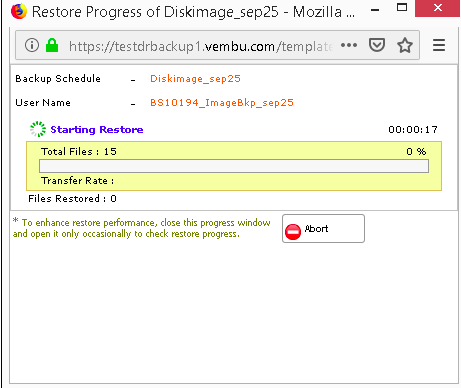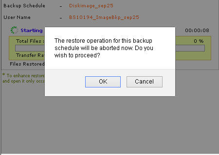 - You have the option of aborting the restore process. From the restore progress page click the Abort option, this will open a pop-up window as displayed below. Click Yes to abort the restore.