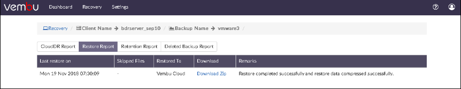 - Once the restore is completed, the data will be available in zip format in the “Restore Reports" page. You can download the Zip file.