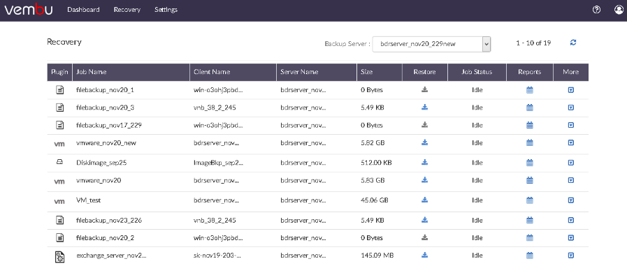 - Login to your BDRSuite CloudDR server and choose the Recovery tab. On the recovery page, click the Restore option beside the corresponding MS SharePoint backup that is to be recovered. In case you are not able to identify it with the backup name, you can identify it with the plugin type from the plugin tab.