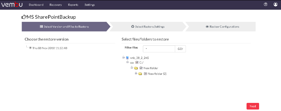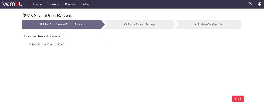- Proceeding with the MS SharePoint restore will let you select the restore version. A tree listing various backup time-stamps with the full backup as its parent node will be displayed. This list that is generated is based on incremental and retention configured. In case an additional full backup is configured, then there will be more than one parent node list based on the configuration. The first step will be to select the restore version and click Next to proceed with the restore process.