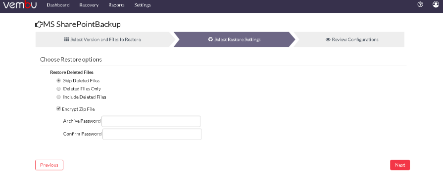 - You can encrypt the files that are being restored using the Encrypt Zip File option. Provide the password and click Next to review configurations.