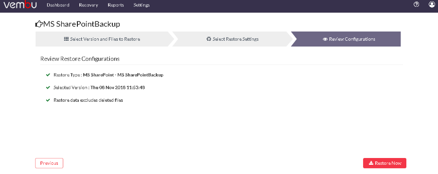 - Click Restore Now option. This will trigger the restore process. Review restore progress and make sure it gets completed successfully.