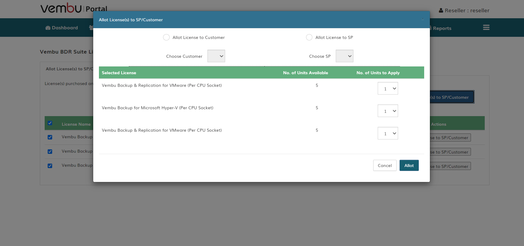 Under the Allot Licenses to SP/ Customer tab, choose the server type and click on Allot Licenses to SP/ Customer button alongside the licenses. Once done you will see a pop-up asking you to allot the license by choosing either the customer or the service provider.